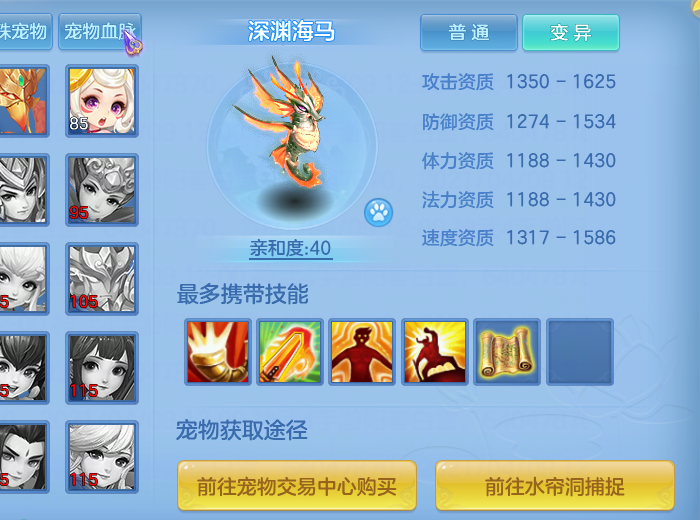 以上就是神武4手游深渊海马的打书攻略。尽管龙虾的存在让海马显得颇为不起眼,但既然这种宠物存在,自然有其价值所在,而且在同等级的宠物排行榜中,海马的数量其实并不少。海马本质上是一种高伤害、高爆发的群体输出宠物,即便将其培养成血法类型,凭借特殊技能的效果,它的伤害依然相当可观。所以,如果洗不出龙虾,选择洗海马也是个不错的方案。