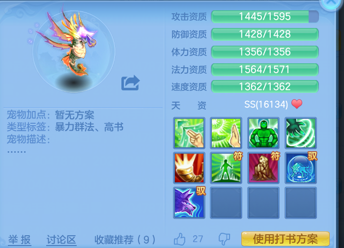 海马作为五技能宠物,也能当作法宠来打书。虽说它速度快但法资不算高,不过恰恰可以利用这点打造敏法宠;而且海马的特殊技能能提升20%法术伤害,效果相当于“高级震慑”。打书时可选择高级法术连击、高级法术暴击、高级强壮、高级逆击,再搭配大法,要是能有个极品神佑大法护符就更完美了。