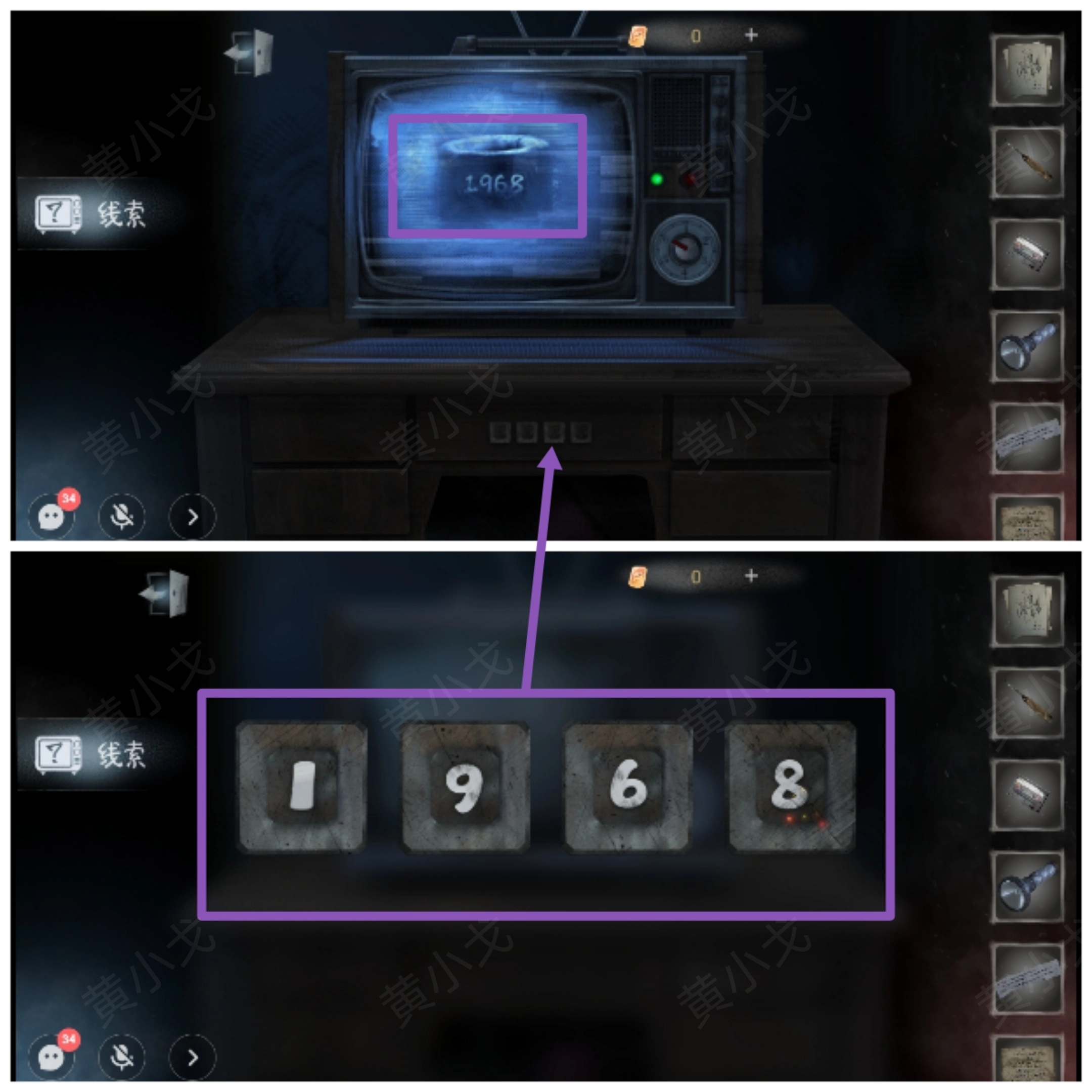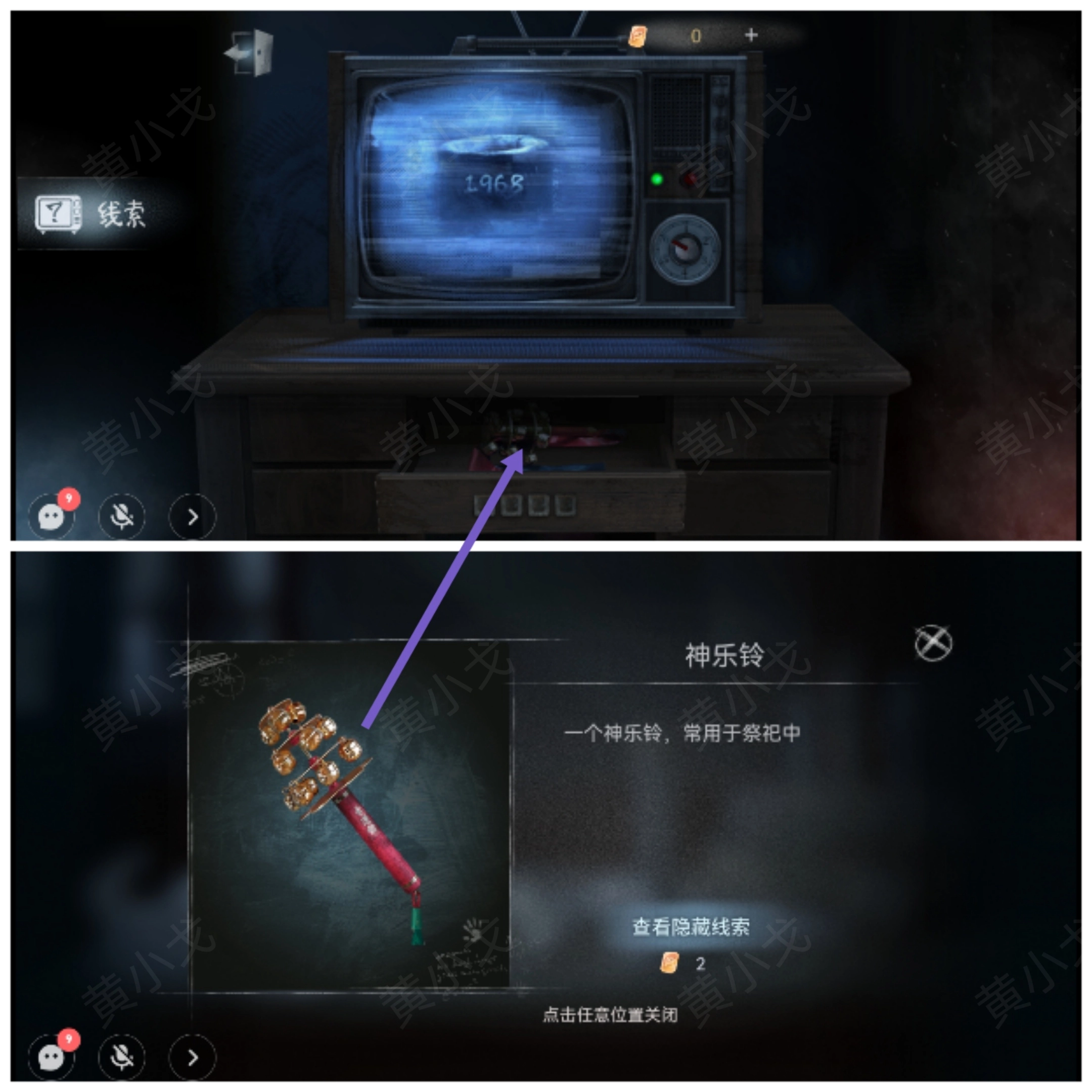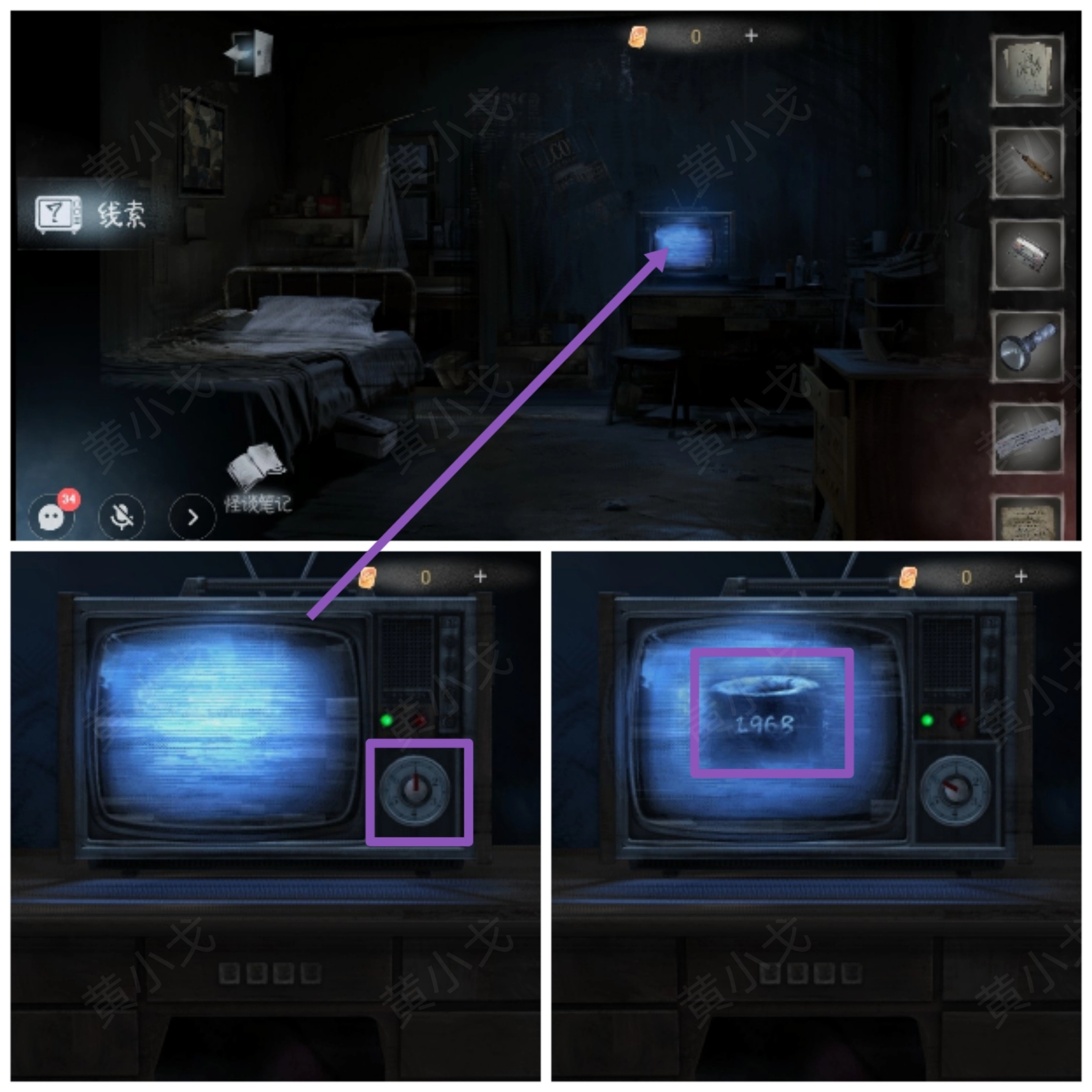 22. 轻点电视,将频道调至6,即可获取线索(1968) 。(值得注意的是,要是调到频道5,会突然有鬼手伸出来……)