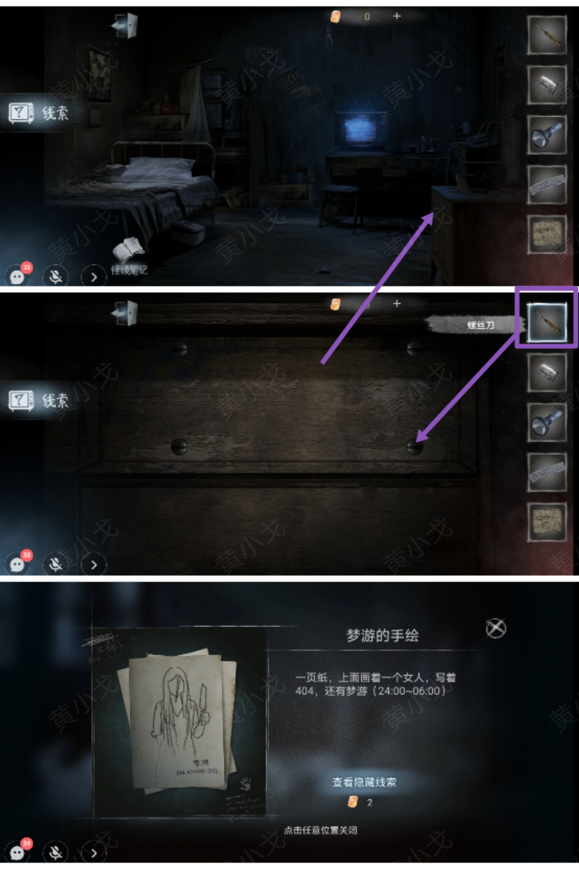 21.点击柜子抽屉,用【螺丝刀】拧开螺丝钉;打开抽屉,获得【梦游的手绘】