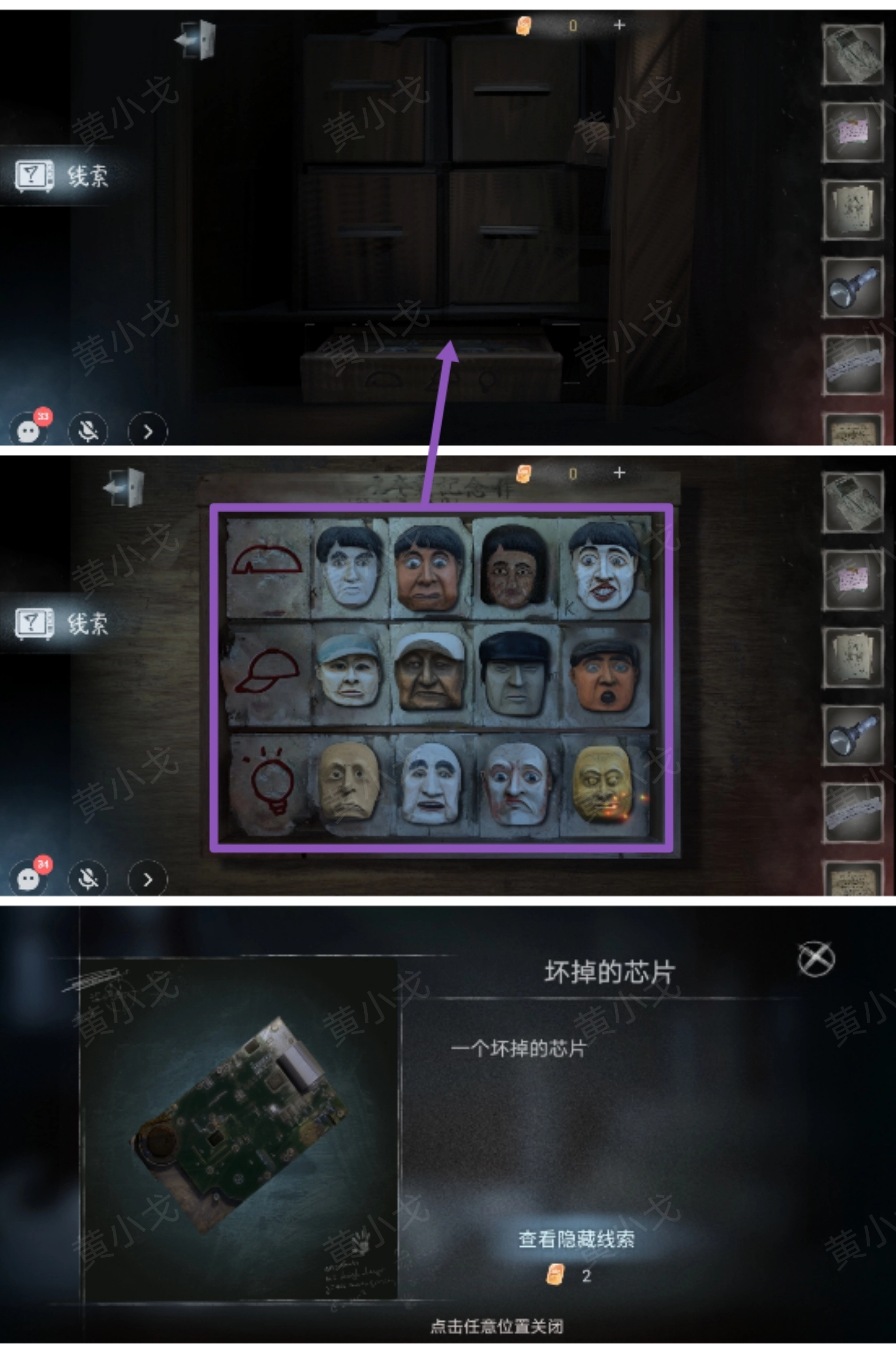 4. 拉开抽屉,依据图案所给提示,将面具脸调整为与之对应的特征(第一行是刘海,第二行是帽子,第三行是光头),之后便可获取【坏掉的芯片】。