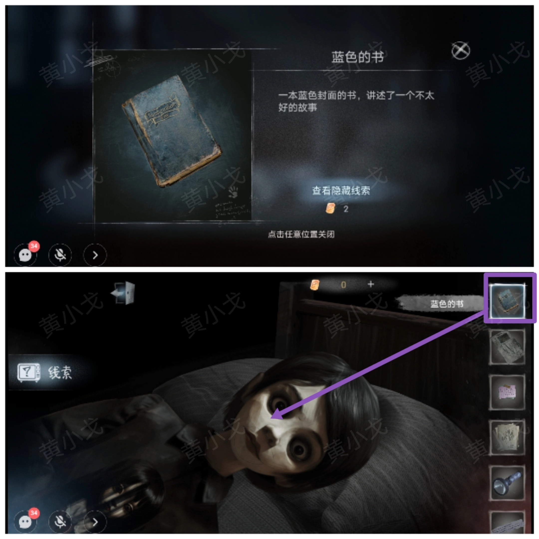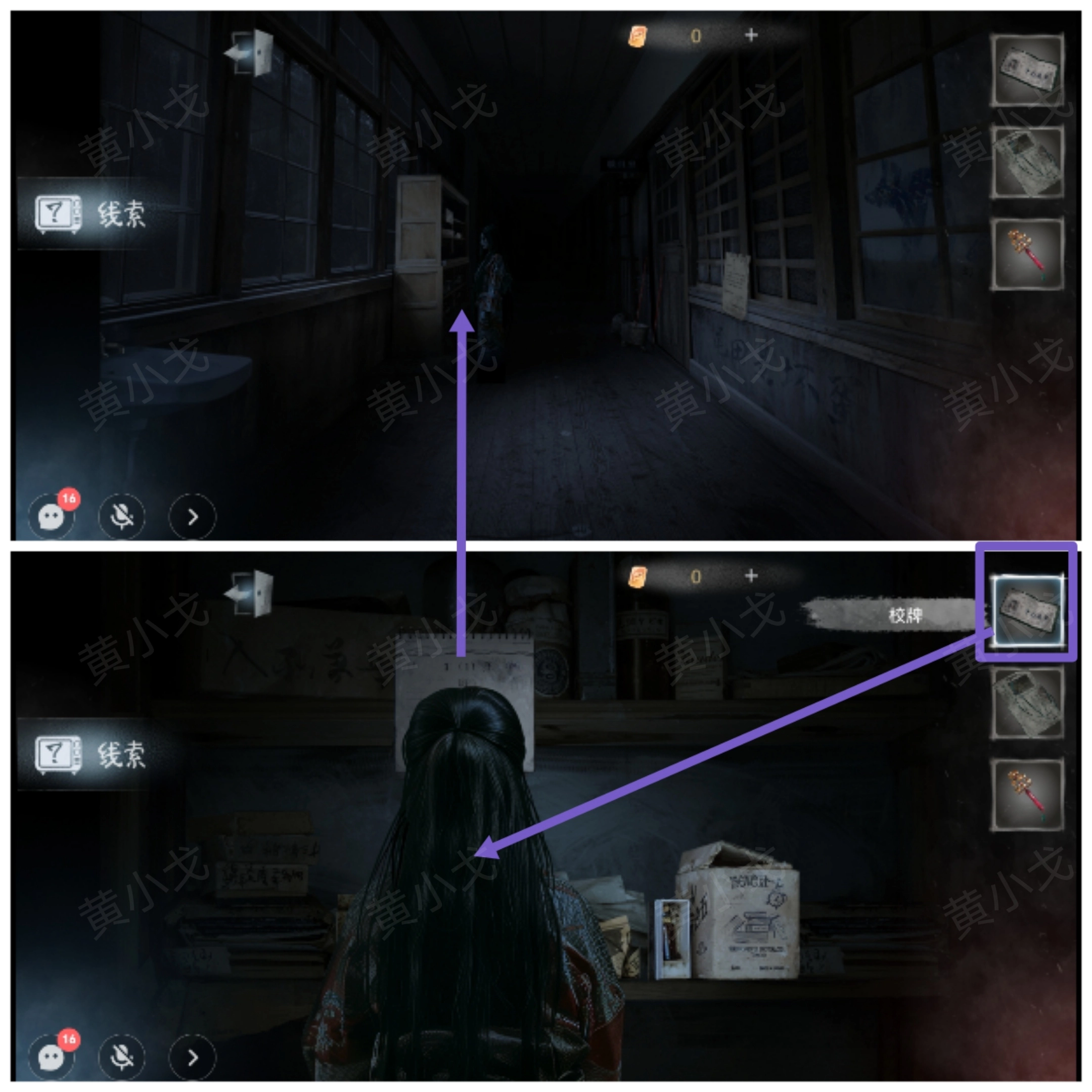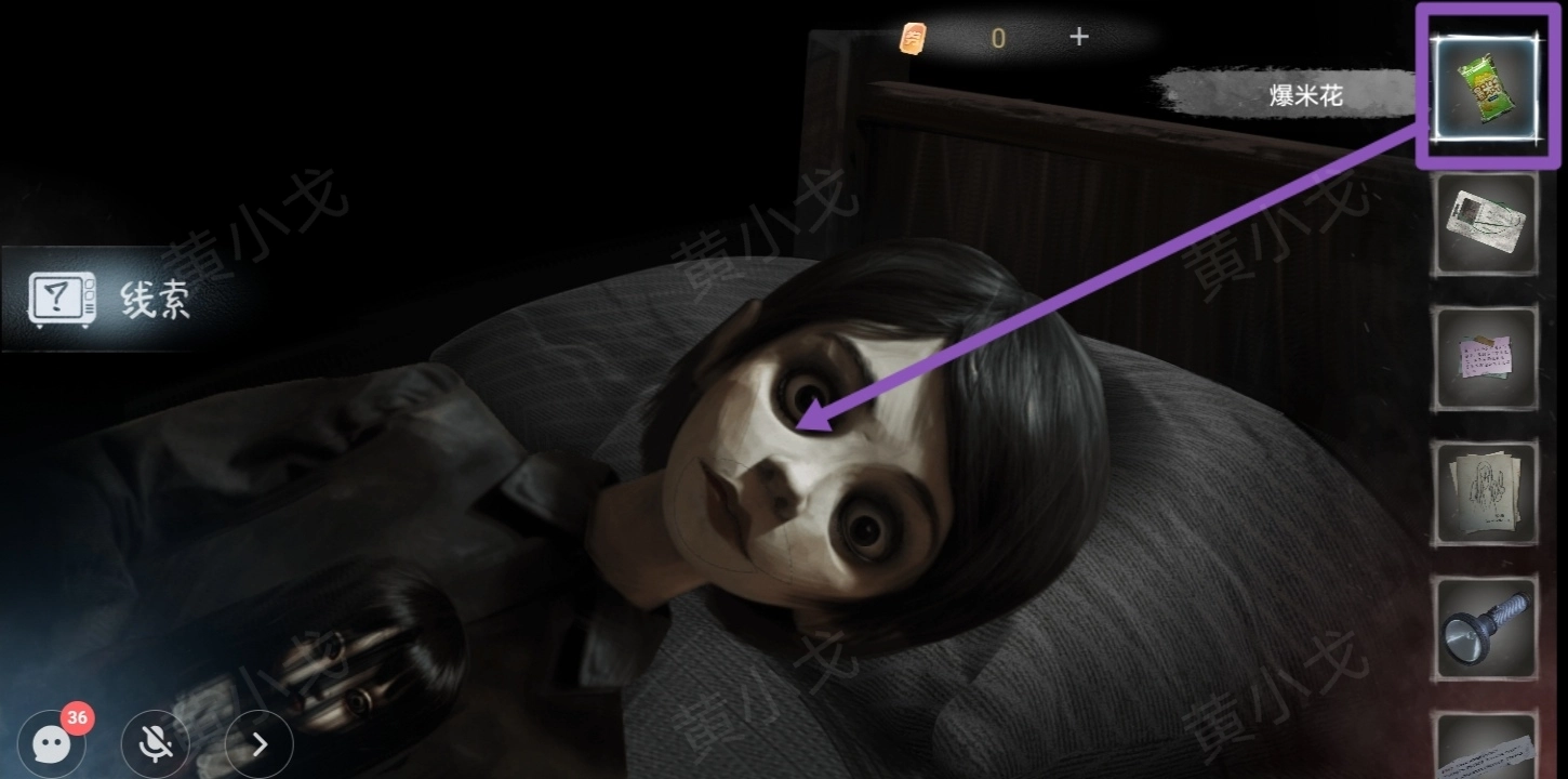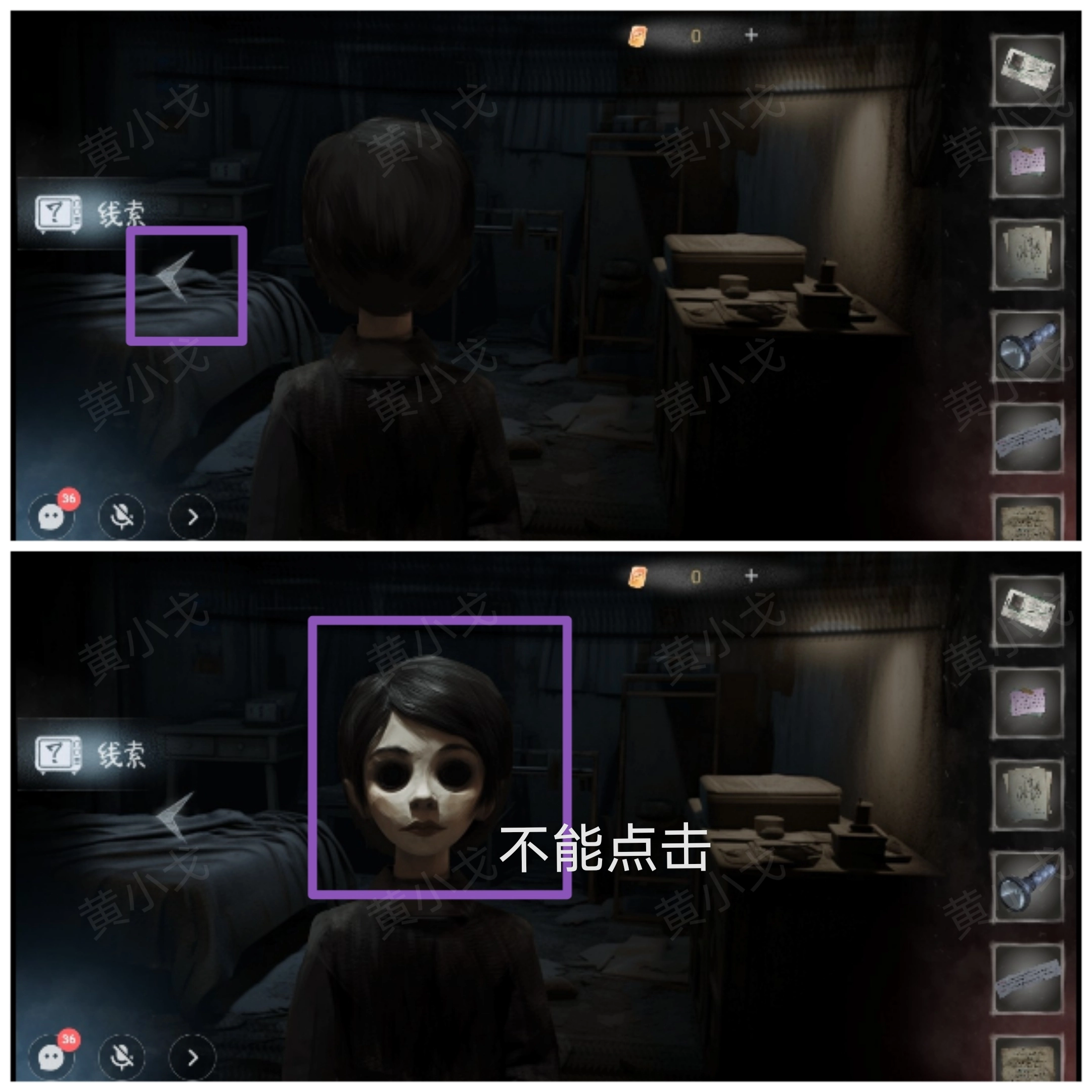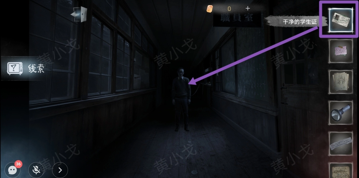 25.使用【老旧的手电筒】,往前走,点击左侧宿舍的门,获得线索(不能让她看见红色?)