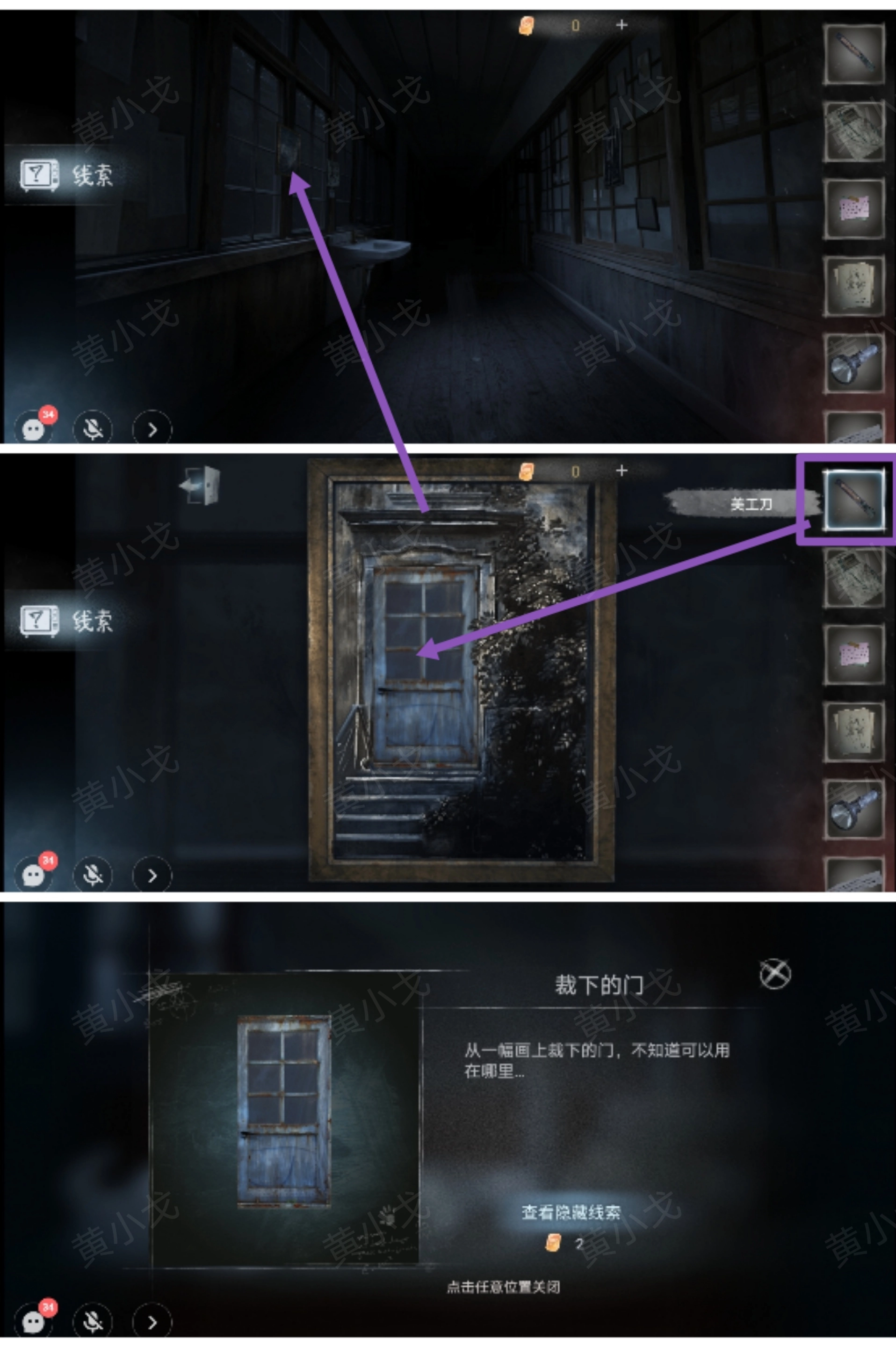 12.点击左侧墙上的画,用【美工刀】割下门,获得【裁下的门】