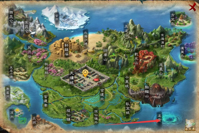 1. 进入问道游戏,随后打开地图,于地图页面选择龙宫,具体位置参照图示。