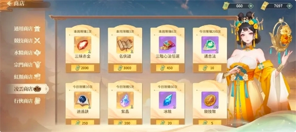 凌云商店其实我也比较纠结,因为货币收入极少,但三昧赤金与名侠谱都是紧缺,看个人选择吧,但是只买这两个,别的都不要买