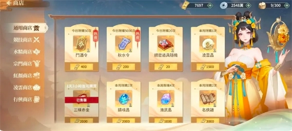 通用商店里的所有物品都得用金券购买。在前期,我仅建议大家购买少量的招募令。毕竟抽卡上头是很多人的常见问题,少买点也没关系,至少能过过瘾。凌云晶是角色晋升到绝世所必需的进阶道具,现阶段还用不着。三昧赤金则是将装备锻造至彩色所需的进阶道具,这两样都称得上是极度紧缺的物品。不过,它们都能通过参与活动获得稳定的获取途径。昊武晶和名侠谱也是一样,前期没必要购买,后期可根据自身的紧缺程度以及金券的剩余数量,再酌情考虑是否购买。