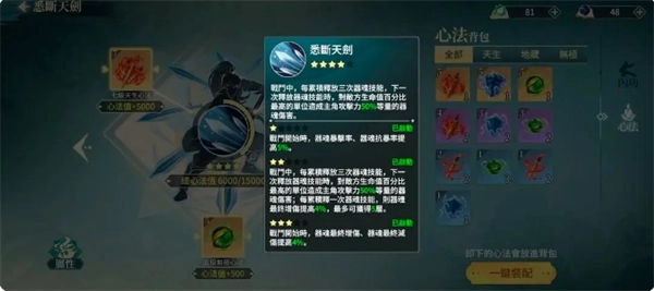 功法分为内功和心法。内功升级依旧参考区里主流队伍的配置,每次升级属性会有10点的增减。后期主升的内功所需升级道具变多,可以适当升级别的低等级内功。四内功搭配四心法,其实可以把它们理解成符文,分别对应攻击、生命、防御属性。每升一级心法,都能获得一定的心法值,心法值攒够了就能解锁buff,而且随着心法值达到不同阈值还能进一步升级buff。符文升级前期建议主升一个,因为每升一级符文所提供的心法值,刚好够升一级buff。打个比方,我现在只装上一个七星符文,把另外两个都卸下来,此时我的buff等级依然是4星,而五星应该就是满星状态,需要3个七星符文,所以后期慢慢升就好。前期不推荐主升内外防御相关的符文。