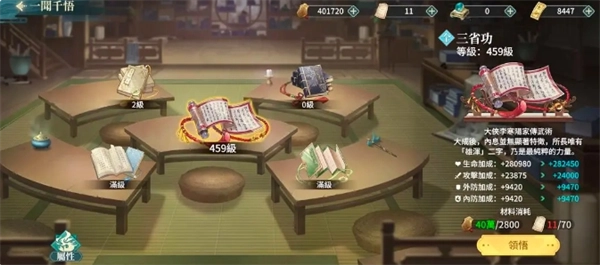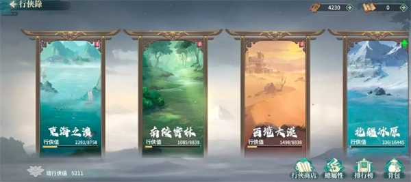 行侠录同样能提升基础属性,还能增加伤害和减免伤害。先把每一本行侠录的速度加成升上去,剩下的就针对区里主流阵容进行升级。升级行侠录会获得行侠值,当行侠值达到一定阈值后,可以通过商店以及活动售卖的道具名侠谱来升级秘籍buff,具体怎么升,根据自身情况看着办就行。