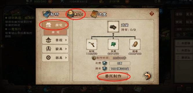 2、选中房屋后,在此处寻找到鸡窝,点击委托制作选项,待进度条满格后,点击下方的验收建筑按钮,即可获取鸡窝。