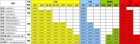 3. 完整度方面,在一枪毙命的前提下仅和口径有关联。举例来说,270口径的枪械只能用于猎杀白尾鹿及体型更大的猎物,而不适用于黒尾鹿、黄鹿、狍子、狼、狐狸这类目标。