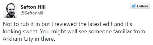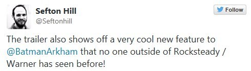 《蝙蝠侠:阿甘骑士(Batman:ArkhamKnight)》的总策划SeftonHill最近难掩兴奋之情,在推特上分享了几条简短的“剧透”内容,称下一支新预告将会为大家呈现不少惊喜与全新细节。