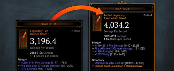 你是否觉得自己的装备已经足够出色?或是全身都换上了极品装备,达到了实力的巅峰?在暗黑破坏神的世界里,追求永远没有终点!2.1.2补丁为你带来了更高的目标——远古传奇。这是传奇物品的全新形态,你能在游戏里寻觅到它们的踪迹。相较于普通传奇,远古传奇的属性有了质的飞跃,整体提升幅度大约在30%左右,不过部分属性不在加成范围内。想要获得远古传奇,你需要在苦痛及以上难度的游戏中挑战,当你掉落传奇物品时,有10%的概率会是远古传奇,而且这个概率会随着苦痛难度的提高而增加。