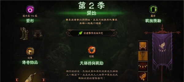 且看当下英雄辈出,第一赛季预计最早于2月初收官,不知各位的赛季征程进展如何?第二赛季将随2.1.2补丁同步开启。和第一赛季一样,第二赛季依旧准备了专属福利:独特的套装两件套幻化奖励、十件赛季限定传奇装备、一套包含外观与徽标的完整战旗,以及专属的天梯成就与战勋。同时,第二赛季还吸取了首赛季的经验进行优化:战旗不再是70级自动解锁,需完成赛季内特定成就方可获取;战勋设计更趋合理且富有挑战性,移除了70级竞速这类单一任务,新增了挑战BOSS、收集随机事件等全新内容。而在备受瞩目的赛季独占传奇装备中,武僧的爆裂掌主题护腕与秘术师的冰甲戒指尤为引人注目。