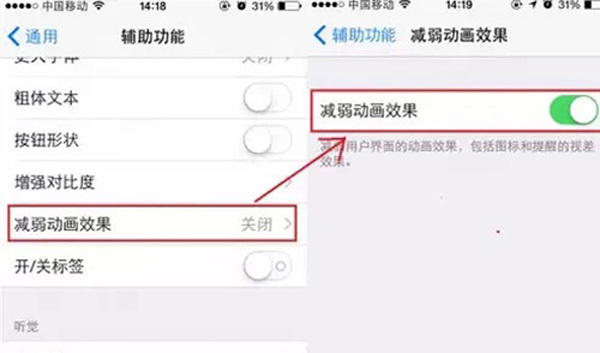 首先进入到设置—通用—辅助功能—减少动态效果,然后点击按钮打开就可以了!打开动画效果使内存占用更多哦。打开这个功能,在一定程度上能让你的iPhone在运行更快更省电!绝招3:把屏幕亮度降到最低