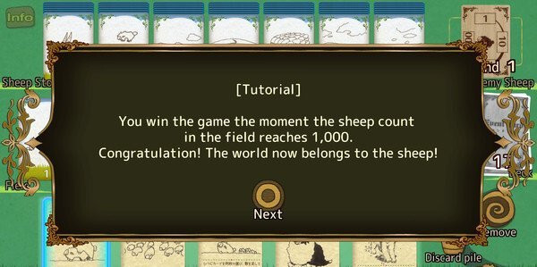 玩家若能在敌人的羊的数量达到1000只之前,抢先在场中打出卡牌“1000只羊”,就算获胜;否则就判定游戏失败,并且己方本轮的所有卡牌都会被清空,需要重新开始。