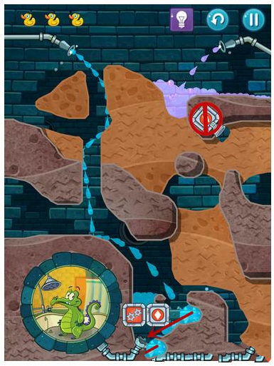 3、待鸭子全部收集完毕后,划开红色机关右侧的泥土,让水流注入鳄鱼小顽皮的屋子中。