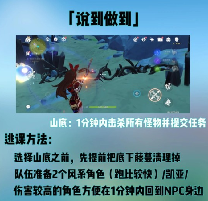 •在选择【山底】选项前,要先用安柏(或者其他火系角色)把地面上的藤蔓清理干净,之后再返回与NPC进行对话,这样才算正式选定【山底】
