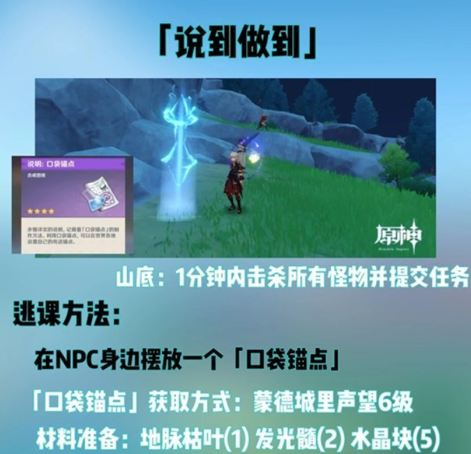 - 要是有口袋锚点的话,在NPC旁边放置一个,打完怪物后直接传送回来就行。(蒙德声望等级达到6级能获取制作图纸,去合成台合成就能得到)