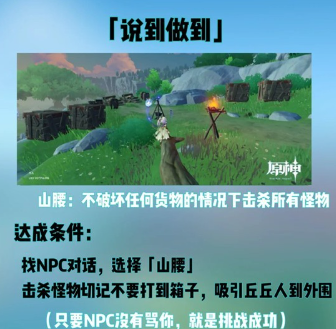 •按顺序击倒火斧丘丘人、木盾丘丘人、水丘丘萨满(要是NPC没对你恶语相向,就算挑战完成)