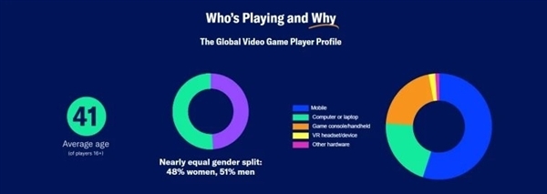 结果表明,全球游戏玩家中女性占比为48%,而在美国的游戏玩家群体里,年龄达到65岁及以上的占22%。