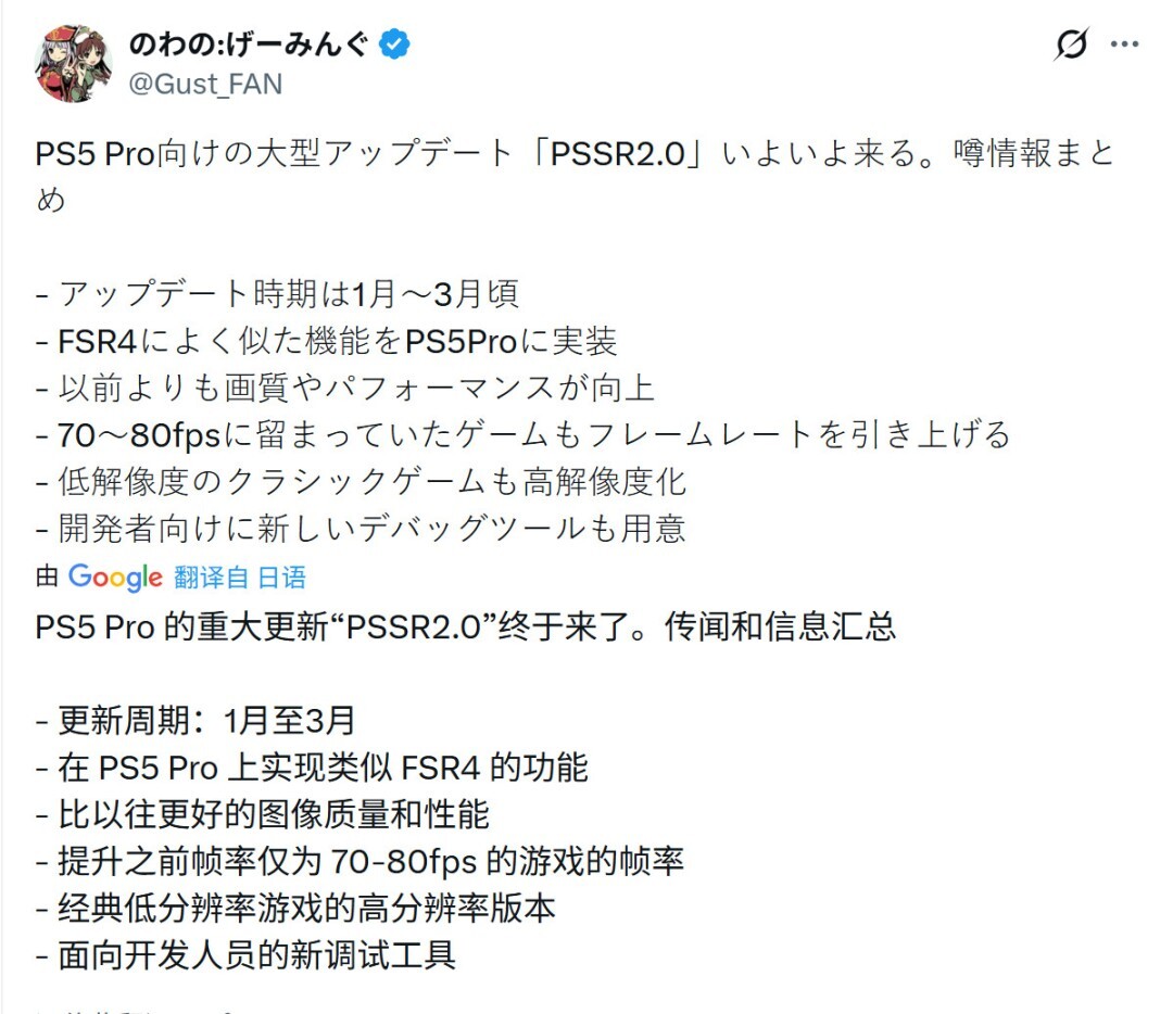 虽然核心技术依托于FSR,但它的实际表现与FSR的水准仍有不小差距。不过索尼计划通过下一代版本PSSR 2来改善这一状况。据近期的相关传闻,PSSR 2预计在2026年第一季度(1-3月)推出,并且此次更新的规模将会非常大。