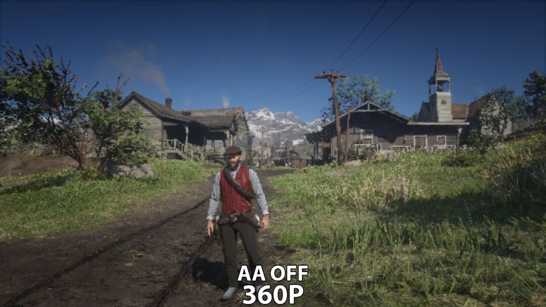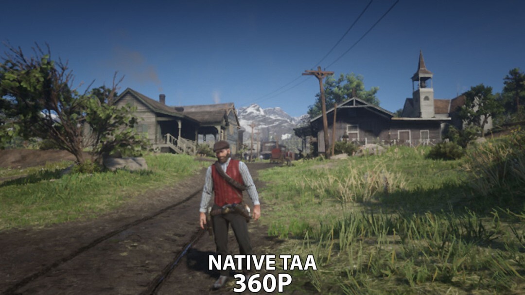 在对比测试中,《荒野大镖客2》以360p的内部渲染分辨率运行,之后借助DLSS 4.5的Preset M模式放大到720p,画面细节的呈现效果十分惊艳。而同样先以360p渲染,再分别通过原生TAA放大至720p或者彻底关闭抗锯齿的画面,在整体清晰度和细节完整性上都存在明显差距。