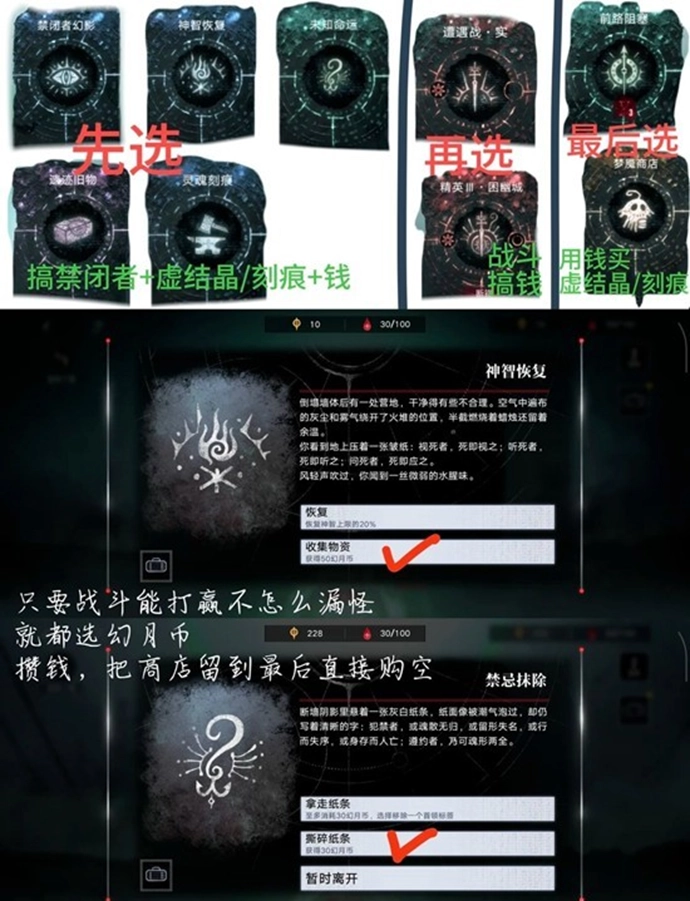 选项优先选虚结晶>满足理智70+的选项>幻月币(据plq的大佬分享,在二三层会碰到需要理智70以上才能选择的“消耗理智获取虚结晶”选项,这种方式比直接用幻月币去商店购买虚结晶更划算)