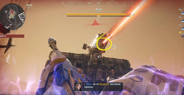 这是一道直线朝前发射的射线攻击,它没办法锁定目标进行追踪,每次造成的伤害不算高,但对护盾的抗性比较强。当玩家还没召唤出机甲的时候,可以靠快速地左右移动来轻松躲开这种攻击;要是已经进入机甲协同作战的阶段,行动受到限制了,那就建议用消耗护盾耐久的方式硬扛下来,但得小心它会高频释放——一旦被连续命中,护盾的存量会被迅速消耗掉。