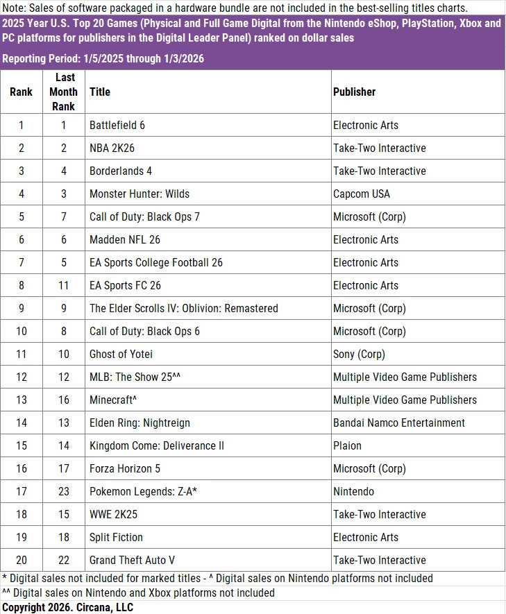 2025年度美国游戏销量排行榜Top 10(包含数字版与实体版)