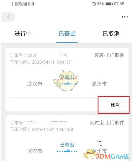 4、接着进入已寄出界面,然后选中要删除的寄件记录,点击删除按钮。