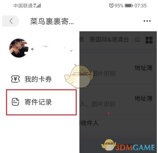 3、随后打开菜鸟裹裹的侧边栏,点击其中的寄件记录选项。