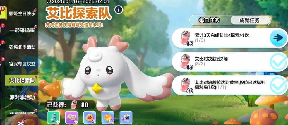1、首先要参与“艾比探索队”活动,积累80个能量瓶,用这些能量瓶兑换一张“茸茸兔生态信息卡”——要是没有这张卡,就算找到再多的点位也见不到兔子,它就相当于捕捉兔子的“通行证”。