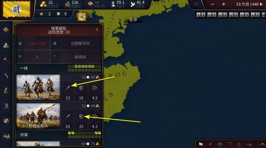 2、在这里,你能看到【精锐剑客】【精锐长枪兵】【骑士】之类的兵种,点击你打算招募的兵种即可。