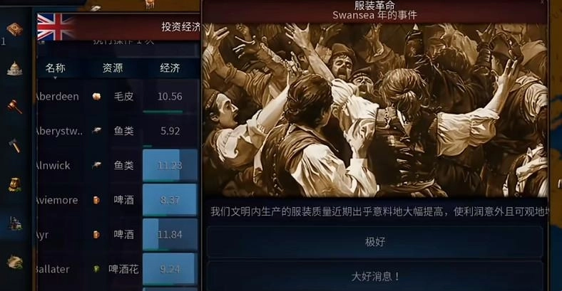 11、我们还见证了服装领域的变革,大不列颠正处在繁荣的黄金时代,让我们共同庆贺吧;要是觉得点按钮太繁琐,不妨直接点击地块,让大不列颠变得更加富饶吧。