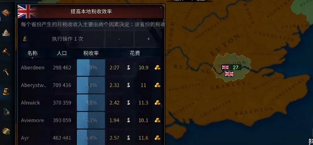 9、伦敦经济发展了,我们投资首都,看到第五栏,我们可以通过花费黄金,直接提高一个地区的税收效率,多次执行操作则可抑制发展;