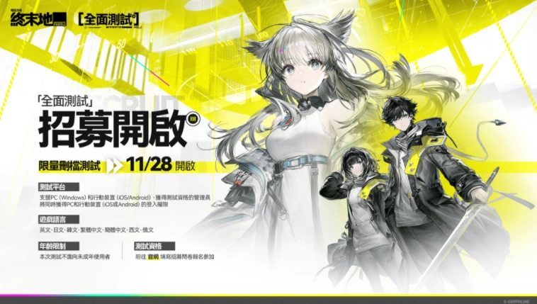全球游戏发行商GRYPHLINE官方正式宣布,《明日方舟:终末地》「全面测试(Beta Test II)」今日起开启招募,测试将在PC(Windows)与手机平台(iOS/Android)同步进行。各位管理员可前往官方网站填写招募问卷,参与资格筛选。若成功获得测试资格,通知信会发送至注册GRYPHLINE账号时绑定的电子邮箱。