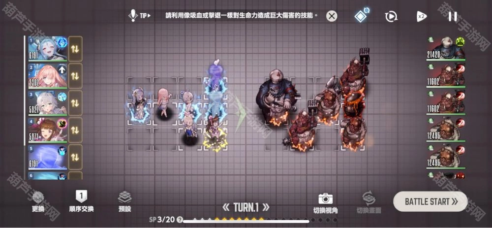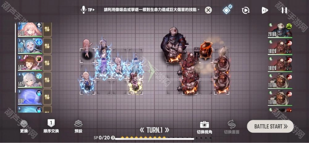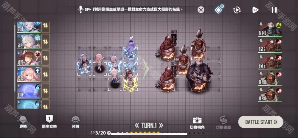 左边第一个位置,先选使者皮,因为它有群体效果,所以具体站位其实没什么影响,只要留意保健社皮能同时给到两只水人就行。第二个位置选个带后推技能的角色,把后排那只水人推到中间,接着把所有增益buff都加上。深蓝色的横排水人先出手,再换浅蓝色的水人出手,两者伤害加起来能到一百万,最后那只水人交给威廉明娜收尾就可以了。