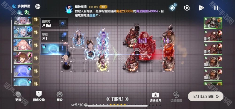 这边得靠泰瑞斯把王推到最后,相当于没保健社,之后推手再把王往后推一格,或者使者墨先炸再推也行,等b偶结束后,深蓝色水人再炸——因为伤害不够,这里必须凹三只全暴击,不然过不了。暴击后剩下的残血交给威廉明娜和浅蓝色收头就可以了。