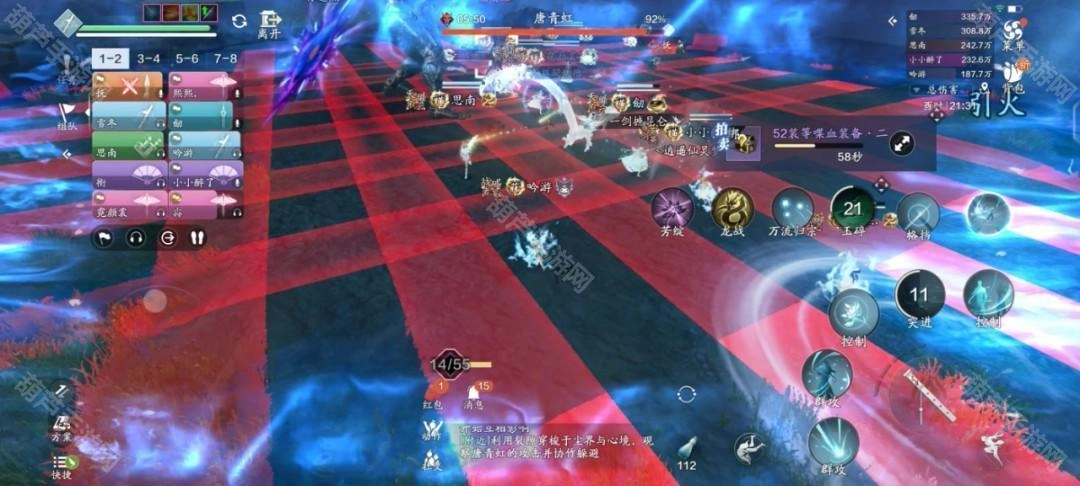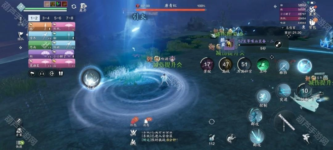2队的4名输出玩家需前往铸剑炉进行“引火”操作,处于引燃状态时玩家会承受不断加剧的持续伤害,所以该队的治疗玩家必须紧随队友进行回血治疗。