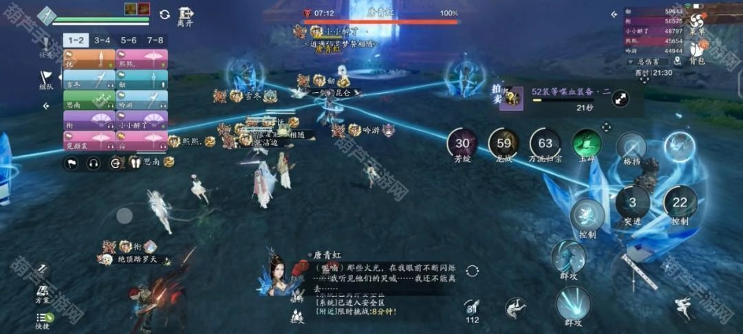 全体成员需聚集在唐青虹身边的安全区内,注意分散站位,以防矩形范围技能的伤害重叠。承伤与治疗玩家要把握好时机,及时释放“凝冰”之类的减伤技能,硬扛住矩形范围技能及其后续的结晶攻击。