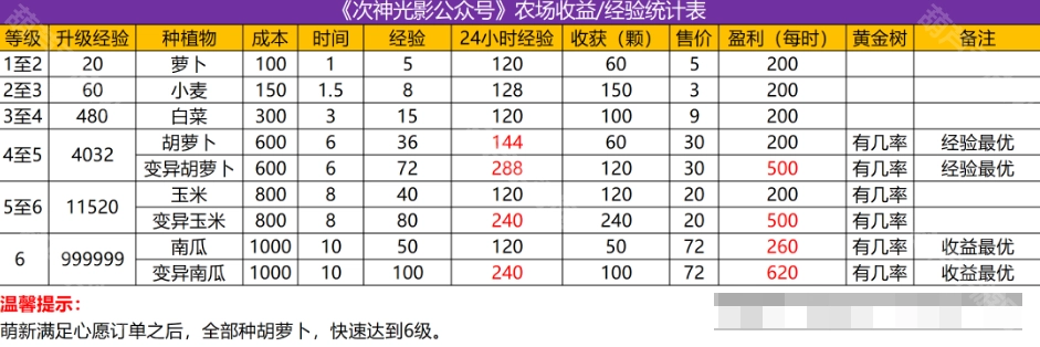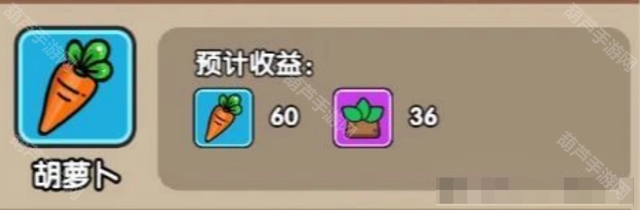 胡萝卜:种子600白金币,收益60颗,36经验,收获时间:6小时。(经验最优)