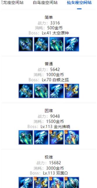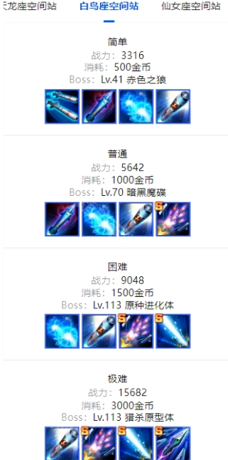 Boss模式包含四座空间站,S装备的获取途径之一是通过该模式,消耗挑战币与金币可产出不同部位的装备,还能消耗钻石额外增加挑战次数。