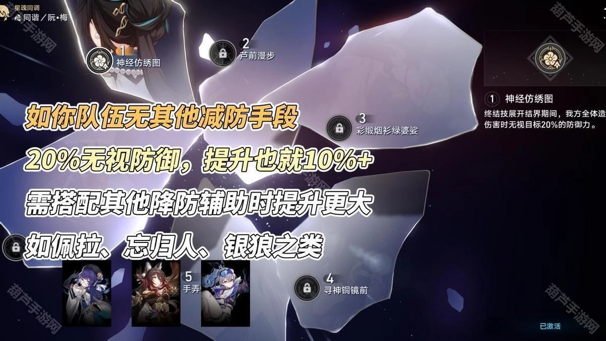 终结技期间提供20%无视防御,至今仍在使用阮梅的玩家可考虑,对输出伤害提升在10%以上。