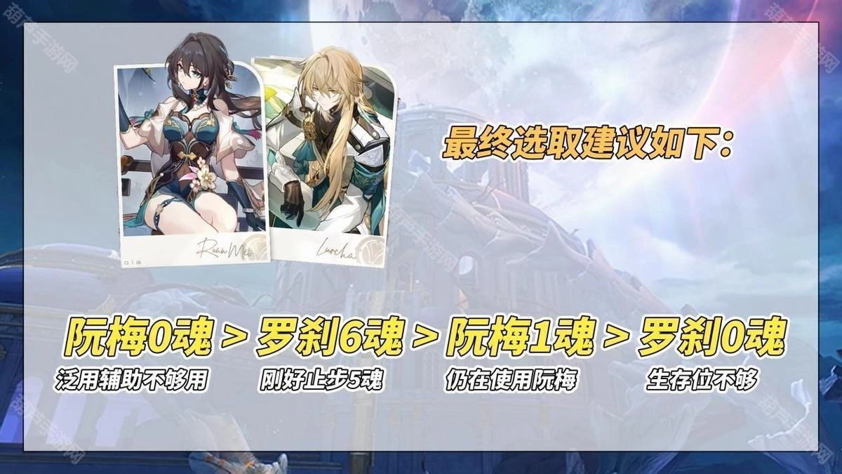 总结:阮梅0魂(泛用辅助性能不足)>罗刹6魂(实际效果仅达5魂水平)>阮梅1魂(仍可正常使用阮梅)>罗刹0魂(生存位能力欠缺)