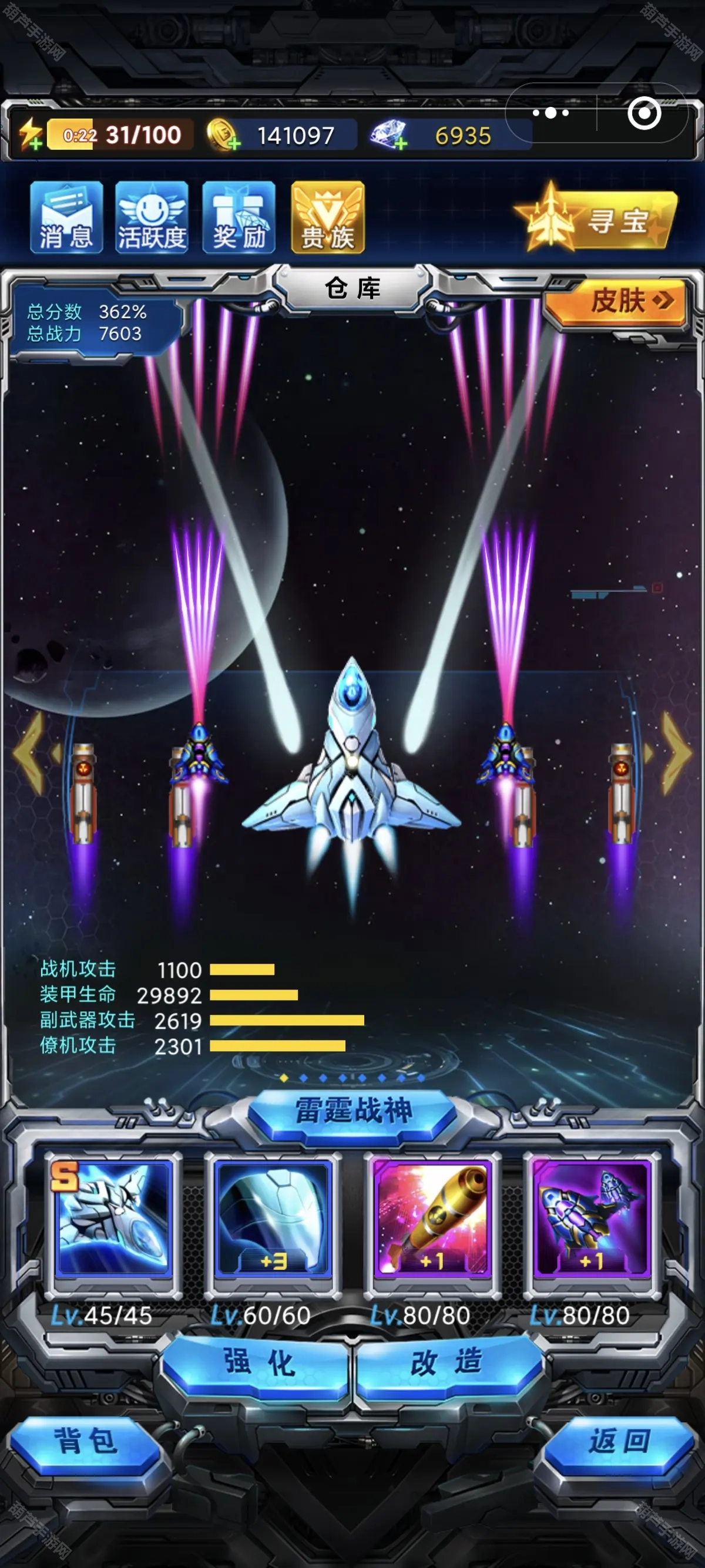 战力足够时就能更换普通装备了,战神进阶到后面两阶所需的材料会多不少,可以先把其他方面提升起来,再去把战神进阶到MAX。主要优先升级僚机和副武器(毕竟伤害才是最关键的)。