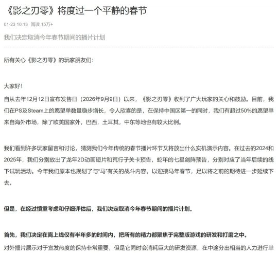 《影之刃零》制作人Soulframe在题为“《影之刃零》将度过一个平静的春节”的微博中透露:“自去年12月12日公布2026年9月9日的发售日以来,游戏收到了众多玩家的关心与鼓励。目前PS和Steam平台的愿望单数量正稳步上升,值得欣喜的是,在持续占据中国区第一的同时,超50%的愿望单来自海外市场——除欧美地区外,巴西、土耳其、中东等地也占了不小的比例。”