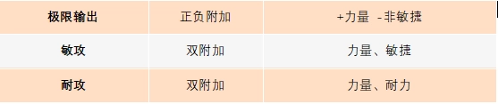 附加属性:单附加(如+12力量) 、双附加(如+10力量 +10敏捷)、正负附加(如+24力量 -8体质)