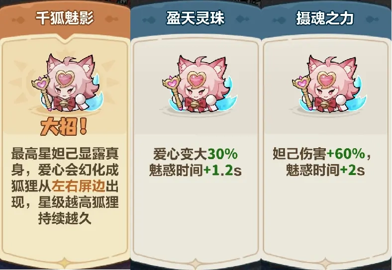 最高星的妲己每次提升1星,爱心的持续时间与魅惑时间增加。