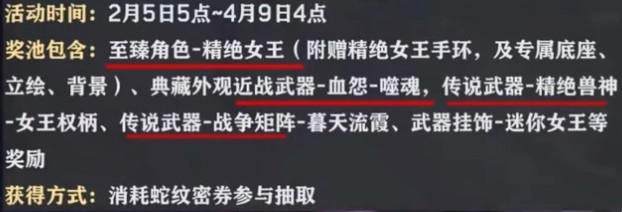 5.参与【新春补给】活动,能够免费获取十张【蛇纹密券】,使用蛇纹密券在精绝女王抽奖池进行抽奖,有机会获得该武器。