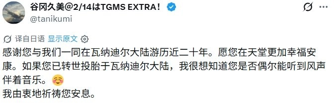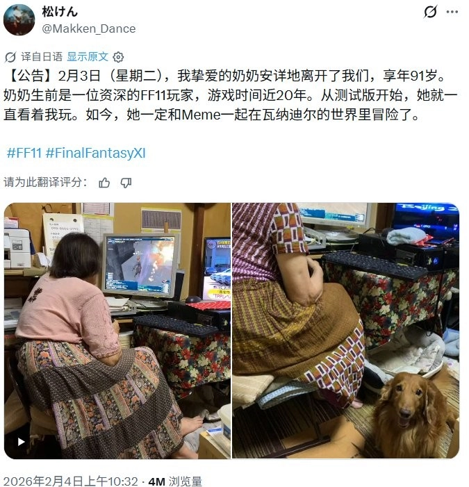 她的孙子在社交媒体上发文表示:“2月3日周二,我深爱的祖母离世了,享年九十一岁。在健康状况变差之前,她是一位玩了将近二十年《最终幻想11》的老玩家。从测试阶段起,她就看着我玩这款游戏。我猜她此刻正带着她的狗狗Mimi,在瓦纳迪尔的世界里开启新的冒险呢。”
